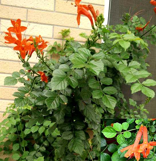 半藤状或近直立灌木。枝带绿褐色,常有小痂状凸起。叶对生,单数羽状复叶;总叶柄长约3~6厘米,小叶柄短;小叶多为7枚,卵形至阔椭圆形,长1~2.5厘米,先端短尖或钝,基部阔楔形,边缘有不甚规则的锯齿,秃净或于背脉腋内有绵毛。总状花序顶生;萼钟状,5齿裂;花冠漏斗状,略弯曲,橙红色至鲜红色,有深红色的纵纹,长约4厘米,上唇凹入;雄蕊突出。蒴果线形,长2.5~5厘米,略扁。花期春季。18.16