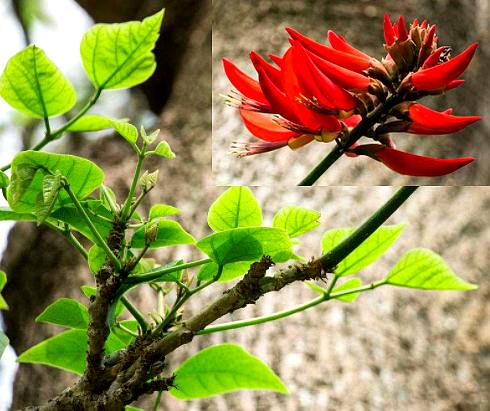 落叶乔木,高7~8米。茎、枝上有短硬刺。3出复叶,有柄;小叶片近肾形,长10~20厘米,宽8~19厘米,先端突尖,基部近截形。总状花序腋生,花密集于总花梗上部;萼短,2唇形;花冠蝶形,红色,长达4厘米;雄蕊10,5长5短;子房具柄,有黄色毛。荚果梭状而弯,顶端有喙,基部有柄,长约10厘米。种子黑色,肾形,光亮。花期8~9月。果期10月。