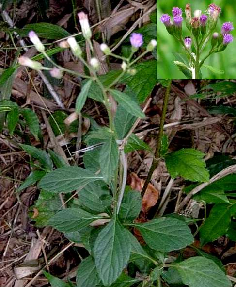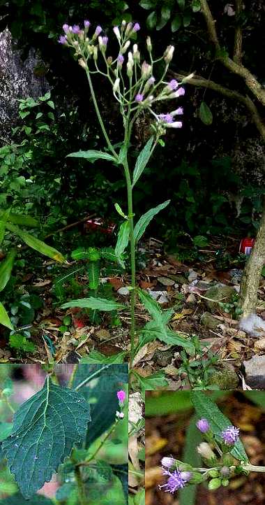 一年生草本,高20~80厘米。茎直立,柔弱,少分枝,稍被毛。叶互生;具柄;披针形至卵形或倒卵形,长2~6厘米,宽1~3厘米,先端钝或短尖,边缘有浅齿,基部狭楔尖,下延至叶柄,两面疏被毛;近枝端的叶较狭而小。头状花序长约7毫米,宽约2.5毫米,排列成疏散的伞房花序;总苞片数列,锐尖,最外列较短;全部管状花,两性,约20朵,淡紫红色,花冠长于苞片2倍,先端5裂.瘦果圆柱形,长约2毫米,有线条,被毛,冠毛白色,多数。花期全年。