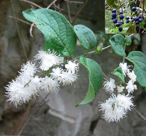 落叶灌木,高1~3米。嫩枝密被柔毛。单叶互生;椭圆形、倒卵状椭圆形,长3.5~7厘米,宽2~4厘米,先端短尖,基部钝形或广楔形,叶缘具细小点齿,上面具疏毛,下面密被白茸毛;叶柄长3~5毫米,有柔毛,无托叶。圆锥花序,腋生和顶生,长4~6厘米,花梗、花柄。嫩枝均同色,并具柔毛;萼5裂,三角形,长约2毫米,宿存,密被柔毛;花冠白色,基部合生,裂片5,卵形,长约3毫米;雄蕊多数,聚成5束,每束有雄蕊10余枚,着生于花冠基部,花丝白色,花药浅黄色,2室,背着;雌蕊1,花柱白色,与雄蕊相等长,柱头不裂,子房下位,2室。核果蓝黑色,圆形,长约6毫米;径约3.5毫米。种子圆形,多数。花期6~7月。果期10~11月。18.43
