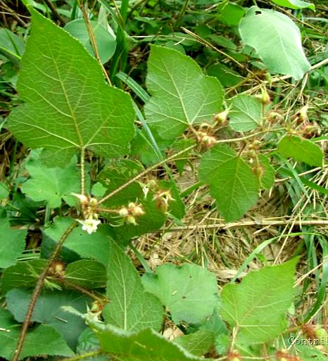 常绿蔓生小灌木,高20~40厘米。茎无皮刺,茎和叶柄、叶片下面中脉、总花梗、花梗及萼均密生紫色刚毛状长腺毛和淡黄色绢毛。单叶互生,纸质,卵形或宽卵形,长4.5~10.5厘米,宽3~10厘米,掌状3~5浅裂,先端渐尖,基部心形,边缘有尖锯齿,两面有柔毛;叶柄长2.5~5.5厘米;托叶羽状深裂,裂片条形。花3~5朵,成腋生短总状花序;苞片似托叶;花白色,径1~1.5厘米;萼裂片披针形,内外两面密生柔毛;花瓣5片;雄蕊多数,药椭圆形;雌蕊花柱呈线状,长于雄蕊。聚合果半球形,径约1厘米,暗红色。