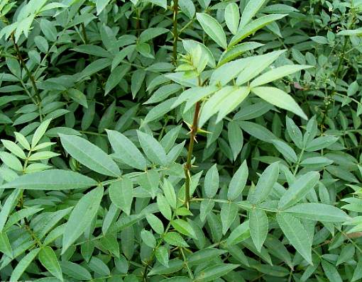 攀援状灌木。枝圆柱形,无刺。单数羽状复叶,小叶11~17枚,叶轴有倒钩刺;小叶对生;有短柄,小叶片革质,卵状披针形,长2.5~5厘米,宽1.2~2.2厘米,先端短尖,基部圆形或阔楔形,全缘,上面有光泽,下面有多数黑色小腺点。全年可采。