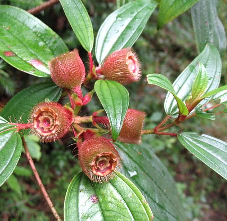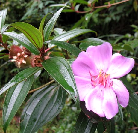 常绿小灌木,高1米以上。茎圆柱形,密被紧贴的褐色鳞片状、有小刺的粗毛,多分枝。叶对生,长椭圆形至长卵形,长5~10厘米,宽3~6厘米,先端长渐尖,基部通常楔形或阔楔形,基出脉通常5条,稀7条,两面有紧贴的粗毛。花大,直径达3厘米,粉红带紫色,常3~7朵聚生于枝顶。蒴果壶形或椭圆形,长约1.3厘米,外有紧贴粗毛,肉质,不规则开裂。种子细小,多数,黑色。