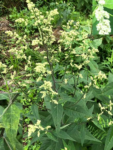 多年生直立草本,高60~100厘米。茎有明显纵肋,被细毛。叶互生;长椭圆形或披针形,长6~9厘米,宽2~4厘米,先端渐尖,基部狭窄成短柄,边缘具锐尖锯齿,上面绿色,下面灰绿色,有蛛丝毛,中脉显著;上部叶小,披针形,长约1.5厘米;下部叶花后雕落。头状花序,钟状,长约3毫米,密集成穗状圆锥花丛;总苞片4轮,淡黄色,无毛,覆瓦状排列;外层花雌性,管状,雌蕊1;中央花两性,管状,先端5裂,雄蕊5,聚药,花药先端有三角状附属物,基部有尾,雌蕊1,柱头2裂,呈画笔状。瘦果矩圆形。花期7~9月。果期8~10月。