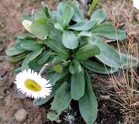 多年生草本,高20~30厘米。根茎粗壮,其上密生纤细的须根。叶为单叶,基生叶密集,匙形,长3~5厘米,宽1.2~1.5厘米,两面有毛,边缘常皱波状,基部下延成柄,柄带红色;茎生叶长圆形,长仅2厘米,宽约0.6厘米。头状花序顶生,常单个,边缘有2列紫色舌状花,中央为黄包管状花。瘦果扁平,有柔软的冠毛。花期夏季。
