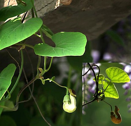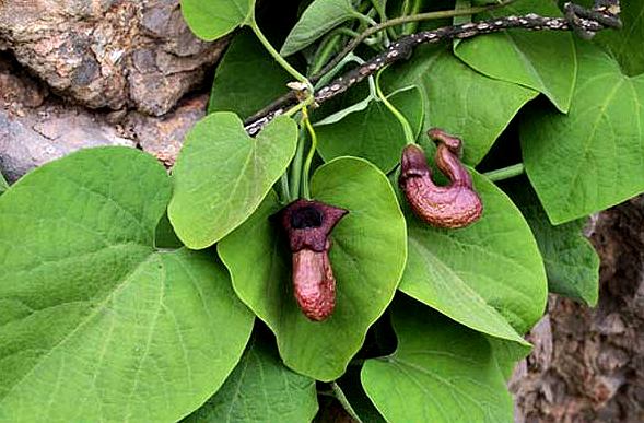缠绕藤本。茎具灰色栓皮,有纵皱纹。叶互生;叶柄长10~13厘米;叶片圆心脏形,长12~20厘米,宽15~23厘米,先端稍钝或尖,基部心形,全缘或微波状,下面有稀疏的短毛,基出脉5条。花腋生,花梗基部具1~2片淡褐色的鳞片,并密生茸毛;花被筒长5~6厘米,呈马蹄形弯曲,上部膨大,外面淡绿色,内面于合蕊柱处有毛,管部褐色或淡黄绿色,3深裂,裂片广三角形;雄蕊6,成对贴附于柱头的外面;合蕊柱三棱形,柱头3浅裂;子房圆筒状。蒴果六面状圆筒形,长9~11厘米,直径3~4厘米,淡黄绿色,后变暗褐色,由顶部空间裂开为6瓣。种子心状三角形,淡灰褐色。花期5月。果期8~9月。