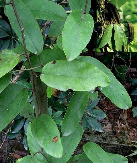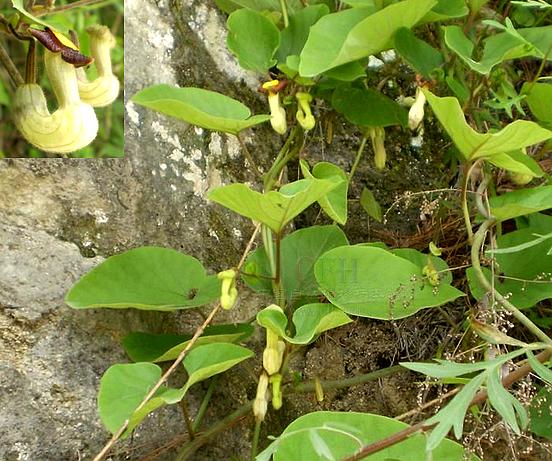 攀援性半灌木,嫩枝密生黄褐色茸毛。叶互生,宽卵形,长4~20厘米,宽3~12厘米,基部心形,全缘,幼叶两面被柔毛,老后下面沿脉有毛;叶柄长2~10厘米,被黄褐色茸毛。花单生叶腋;花梗长2~6厘米,近中部着生一枚圆形苞片,被柔毛;花被长4~6厘米,密生短柔毛,筒部呈"U"字形弯曲,顶端3裂,裂片圆三角形,上面带紫色;雄蕊6,花药贴生于花柱体周围;子房下位,6室。蒴果黑褐色,长椭圆形,长3~7厘米,自基部开裂为6瓣,具多数种子。