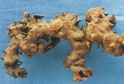 【药材】完整的块茎较粗大,重者可达数斤。外表多丁刺和疙瘩,表面粗糙,呈枯棕色微带红。商品多为不规则的片状,边缘粗糙,带有坚硬的突起细根或根痕。切片表面棕褐色,内心黄色、红棕色或褐红色微带萦。质坚韧,含有黄色的粗纤维,不易折断,断后不具粉质。气味微弱。以色红黄者为佳。