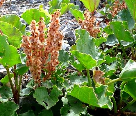 多年生草本。根茎粗大,紫色。茎高约30厦米,粗大,紫色,被短毛或近于无毛。基生叶多数,具紫色长柄,长约8厘米,基部有长而呈截头状的托叶鞘;叶片阔心脏形,长约6厘米,宽约7厘米,先端短尖,基部心形,边缘略呈浅波状,并疏生短刺,上面平滑,绿色,叶脉及边缘均呈紫色,下面脉上有毛;茎生叶互生,托叶鞘阔大;叶柄愈向上愈短。总状花序顶生,排列成圆锥花序式;花梗长约3毫米;花被4,白色,边缘紫色;雄蕊6;子房压扁,花柱2。瘦果两面凸起,具2翅。花期6~7月。