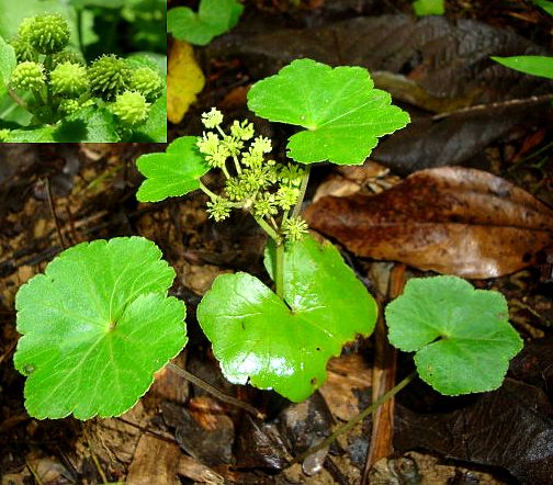 多年生草本。茎匍匐蔓生,节上生不定根与不定芽,逐渐长成直立茎,高15~30厘米,质柔软,被疏生细毛。叶稀疏而互生;叶片近圆形,掌状5~7浅裂,裂片先端钝,边缘具钝缺齿,基部呈心脏形,掌状叶脉较为明显,绿色,两面被紫色细毛;具柄,长1.5~9厘米,基部有托叶鞘。伞形花序,小球形,直径约6毫米,单生或数个聚生于小枝上端;总花梗长0.5~2厘米;小花绿白色;萼齿小;花瓣5;雄蕊5;子房下位,2室,每室胚珠1枚;花柱2。双悬果,近圆形,两侧压扁。花期夏、秋。