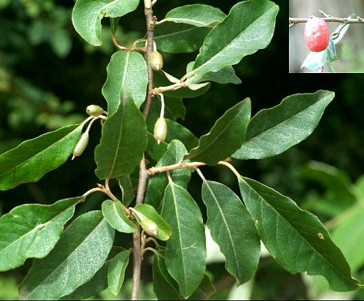 常绿直立或蔓性灌木,长可达6米。小枝圆柱形,红棕色,密被鳞毛。叶革质;叶形变化较大,自长椭圆形、卵状椭圆形至长椭圆状披钟形,长5~12厘米,宽2~5厘米,先端钝或短尖或渐尖,基部楔形至圆形,上面光滑,下面有银灰色鳞片;叶柄长8~16毫米,红棕色。花2~10朵,簇生叶腋,银白色;花梗长2~3毫米;花全长(连子房及裂片)8~12毫米,花被筒管状,上部4裂,内被银白色与棕色鳞毛;雄蕊4;雌蕊1,花柱无毛。果实狭长椭圆形,长约18毫米,成熟时红色,有显著的棱,果柄长12毫米。