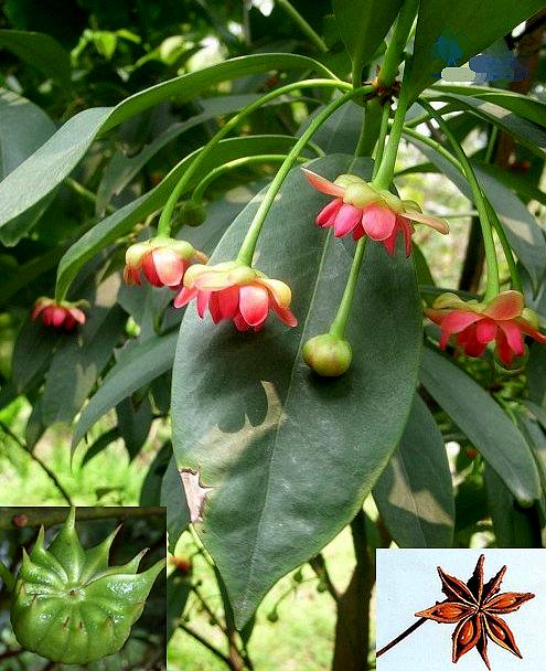 常绿小乔木,高达8米.树皮灰褐色。叶互生,有时呈假轮生状,革质,倒披针形或披针形,长5~12厘米,宽1.5~4厘米,先端渐尖,基部楔形,全缘;叶柄长5~10毫米。花单生或2~3朵生于叶腋。花梗长1~3厘米;花被11~14片,外轮3片黄绿色,萼片状,最小,第二轮3片黄绿色稍带红色,第三轮3片深红色,基部黄绿色,肉质,内轮4~5片,深红色;雄蕊7~11。果实由9~13个??组成,排列成星芒状,先端有长而弯曲的尖头,成熟时内侧开裂;种子1粒,卵状椭圆形,褐色。花期5~6月。果期8~10月。