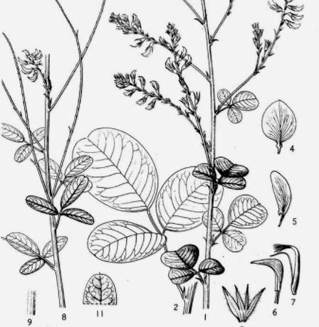 灌木,高1~3米。小枝有棱,被贴生绢毛。3出复叶;托叶小,披针形;小叶卵形或倒卵形,硬纸质,顶端小叶稍大,长4.5~6厘米,宽2.5~4.5厘米,先端圆形微凹,基部圆形稍狭,全缘,下面被柔毛;叶柄长1~3厘米。圆锥花序顶生;花柄长5~6毫米;萼5裂,狭披针形,上面2个合生,有毛;花冠深紫色,长1厘米,龙骨瓣、旗瓣和翼瓣近于等长。荚果椭圆形,被稀疏的绢毛,长5~7毫米。