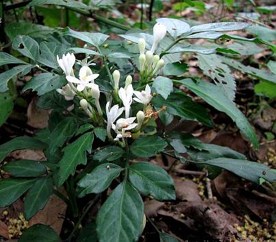 亚灌木,高10~15厘米。茎通常不分校。复叶互生,小叶3片,上面触之粗糙,下面有短柔毛;顶端小叶较大,卵圆形至椭圆状卵形,长3~6厘米,宽2.5~3.5厘米,先端钝尖,边缘有稀疏的大钝齿,基部阔卵形;侧生小叶片近圆形,长2~2.5厘米,宽1~2厘米。聚伞花序腋生,一般为3朵集生;总花梗长6~7毫米;花基部具线形苞片3片;萼5深裂,裂片披针形,绿色,外被细短毛;花冠白色,下部联生成筒状,裂片倒卵形,先端钝尖;雄蕊10,中部与下部联合成筒状,先端10裂,药10枚,生于筒顶;子房5室,每室有2胚珠。蒴果扁球形,被细柔毛,5棱,裂为5瓣,每室有种子1~2粒。花期7月。