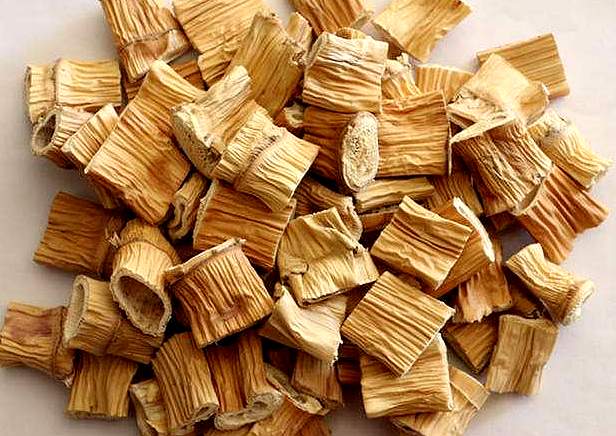 ②干芦根:呈压扁的长圆柱形。表面有光泽,黄白色,节部较硬,显红黄色,节间有纵皱纹。质轻而柔韧,不易折断,气无,味微甘。均以条粗壮、黄白色、有光泽、无须根、质嫩者为佳。
