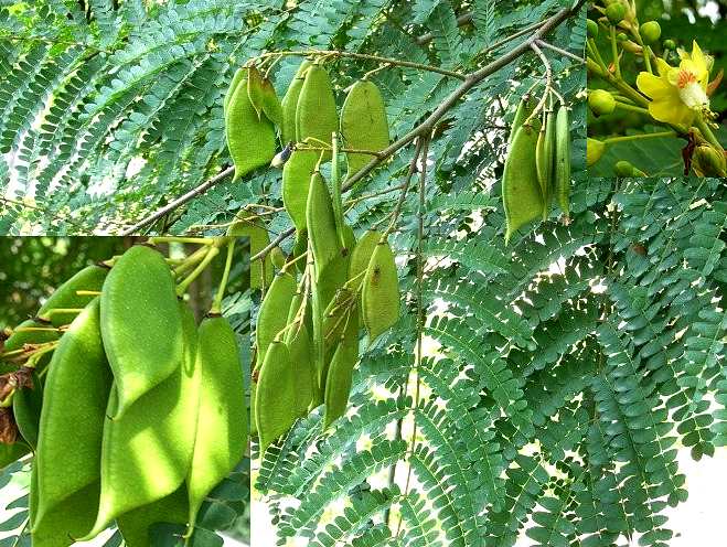 常绿小乔木,高可达5~10米。树干有小刺,小枝灰绿色,具圆形凸出的皮孔,新枝被微柔毛,其后脱落。叶为2回双数羽状复叶,全长达30厘米或更长;羽片对生,9~13对,长6~15厘米,叶轴被柔毛;小叶9~16对,长圆形,长约14毫米,宽约6毫米,先端钝形微凹,全缘,上面绿色无毛,下面具细点,无柄;具锥刺状托叶。圆锥花序,顶生,宽大多花,与叶等长,被短柔毛;花黄色,径10~15毫米;萼基部合生,上部5裂,裂片略不整齐;花瓣5,其中4片圆形,等大,最下1片较小,上部长方倒卵形,基部约1/2处窄缩成爪状;雄蕊10,花丝下部被棉状毛;子房上位,1室。荚果长圆形,偏斜,扁平,厚革质,无刺,无刚毛,顶端一侧有尖喙,长约7.5厘米,直径约3.5厘米,成熟后暗红色,具短茸毛,不开裂,含种子4~5。花期5~6月。果期9~10月。