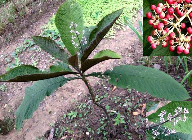 常绿小灌木。根茎呈念珠状,膨大,粗壮。叶通常集于枝端,纸质;叶片长椭圆形或长圆状披针形,长20~40厘米,宽达13厘米,先端渐尖,基部渐狭而成一短柄。边缘有细锯齿,下面红色。圆锥花序顶生;花淡紫色;萼片5裂,裂片近三角形;花冠5深裂,裂片卵形至广卵圆形,长约3毫米;雄蕊着生于花冠管的基部;子房上位,花柱线形,浆果圆形,熟时红色,具细长的果柄。花期4~7月。果期10~12月。