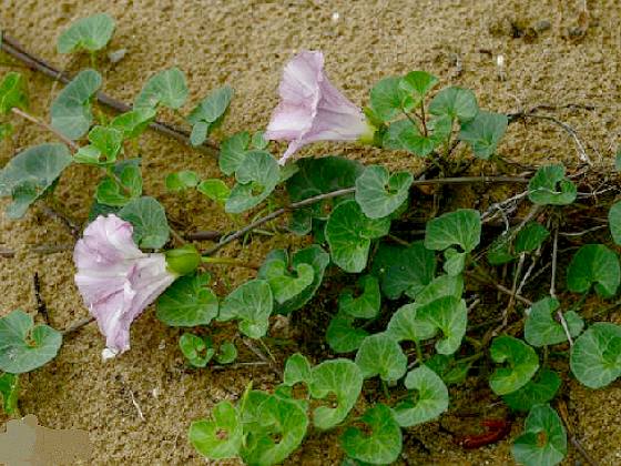 生草本。地下茎粗长,径约7毫米,伸延于砂中,皮粗,褐色;茎细长,横卧或缠绕,无毛。叶互生;肾状圆形,长2~3厘米,宽3~5厘米,先端钝圆,微有小凹或小凸,边缘波状弯曲,基部深心形。质厚,光泽;有长柄。花单生于叶腋,花梗较叶稍长,苞片2,广卵形或广卵状三角形,长1~1.3厘米;萼片5,卵圆形;花冠漏斗状,淡白色,长4~5厘米,具5浅裂;雄蕊5;雌蕊1,花柱丝状,柱头2,扁平,卵形。蒴果卵圆形,苞、萼均宿存。种子椭圆形,黑色,无毛。花期5~6月。