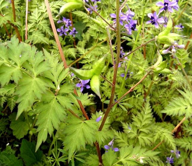 一年生草本,高30~70厘米,遍体有白色毛。叶片菱状卵形或三角状卵形,长5~11厘米,宽4.5~8厘米,2~3回羽状全裂,1回裂片斜卵形,2回裂片或羽状浅裂,或不分裂而呈狄卵形、披针形,宽2~4毫米。总状花序具2~15花,花序轴和花梗有微柔毛;花淡青紫色,直径1厘米;萼片5,堇色,狭长椭圆形,长约5毫米,后方1萼片,伸出1长距,长超过萼片;花瓣2对,上方1对斜楔形,中央有浅凹口,下部成距,插入萼的距内,下方1对卵圆形,深2裂,基部成爪;雄蕊多数;心皮3。??果,长约1~1.6厘米,有种子4粒。花期3~5月。