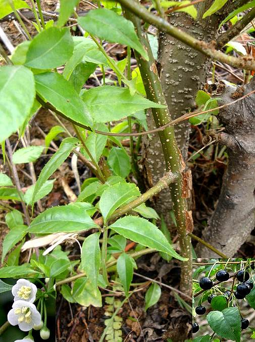 落叶灌木,高1~2米。枝条秃净,嫩时被短毛,紫色。叶互生,卵形、倒卵形或椭圆形,长2.5~8厘米,宽1.5~3厘米,纸质,先端急尖至渐尖,边缘具小锯齿,基部广楔形至浑圆形,上面秃净或略被短毛,下面无毛,主脉隆起;叶柄长6~10毫米。花白色,雌雄异株,雄花2~3朵簇生或单生于叶腋或鳞片腋内,花柄长5~10毫米;4~5数,萼卵形,边缘有睫毛,雄蕊长约3.5毫米,花丝短;雌花单生于叶腋,4~6数,有长达2.5厘米的纤细的花梗,雌蕊1,花柱短,柱头浅裂。果球形,直径约6毫米,成熟时黑色。分核4~6颗。花期4~5月。果期7~8月。