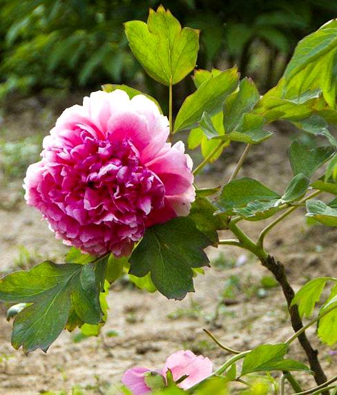 多年生落叶小灌木,高1~1.5米。根茎肥厚。枝短而粗壮。叶互生,通常为2回3出复叶;柄长6~10厘米;小叶卵形或广卵形,顶生小叶片通常为3裂,侧生小叶亦有呈掌状3裂者,上面深绿色,无毛。下面略带白色,中脉上疏生白色长毛。花单生于枝端,大形;萼片5,覆瓦状排列,绿色;花瓣5片或多数,一般栽培品种,多为重瓣花,变异很大,通常为倒卵形,顶端有缺刻,玫瑰色,红、紫、白色均有;雄蕊多数,花丝红色,花药黄色;雌蕊2~5枚,绿色,密生短毛,花柱短,柱头叶状;花盘杯状。果实为2~5个??的聚生果,卵圆形,绿色,被褐色短毛。花期5~7月。果期7~8月。