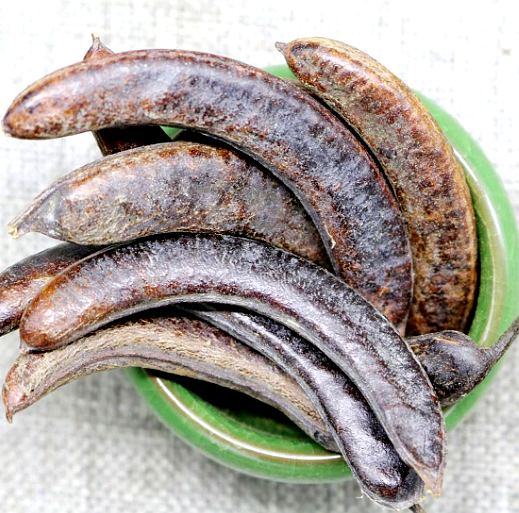 【药材】干燥荚果呈长条形而扁,或稍弯曲,长15~25厘米,宽2~3.5厘米,厚0.8~1.4厘米。表面不平,红褐色或紫红色,被灰白色粉霜,擦去后有光泽。两端略尖,基部有短果柄或果柄断痕,背缝线突起成棱脊状。质坚硬,摇之有响声。剖开后呈浅黄色,内含多数种子。种子扁椭圆形,外皮黄棕色而光滑,质坚。气味辛辣,嗅其粉末则打喷嚏。以肥厚、饱满、质坚者为佳。