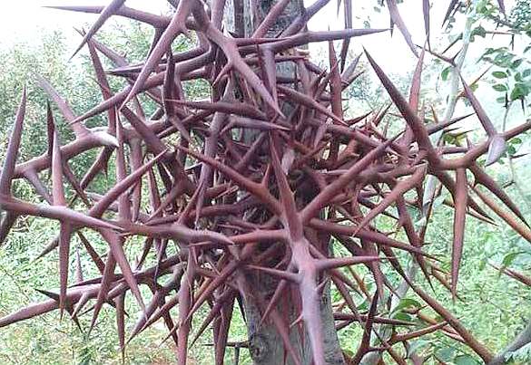 【性状】完整的棘刺有多数分枝,主刺圆柱形,长5~15厘米,基部粗约8~12毫米,末端尖锐;分枝刺一般长1.5~7厘米,有时再分歧成小刺。表面棕紫色,尖部红棕色,光滑或有细皱纹。质坚硬,难折断。药材多纵切成斜片或薄片,厚在2毫米以下,木质部黄白色,中心为淡灰棕色而疏松的髓部。无臭,味淡。以片薄、纯净,整齐者为佳。