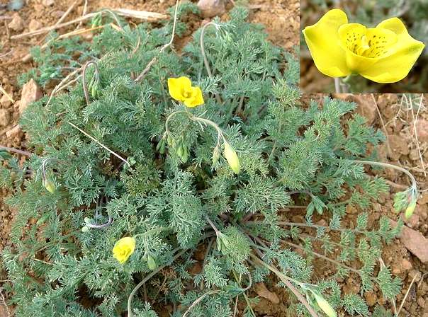 一年生草本,高20~40厘米。茎多数,上部分歧。基生叶12~18枚,长1.5~9厘米;叶片有白粉,轮廓倒披针形;羽状全裂,1回裂片2~5对,约3回细裂,小裂片条形,宽约0.3毫米,先端尖;茎生叶小,无柄,裂片丝状。聚伞花序具少数或多数分枝;萼片2,绿色,有白粉,狭卵形,长约3毫米;花瓣黄色,外面2个较大,扇状倒卵形,长约9毫米,里面2个较小,楔形,3裂近中部;雄蕊4,长约6毫米;雌蕊与雄蕊近等长,子房条形,柱头2,花柱及柱头宿存。蒴果条形,长约5厘米,宽约1毫米,裂为2爿。种子矩形,长约1毫米,两面有显著的十字形突起,黑褐色。花期5~6月。