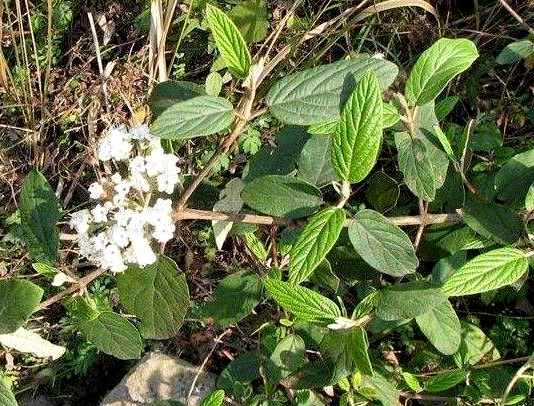 半常绿灌木,高2~3米。小枝浅褐色,具白色柔毛,有臭气,冬芽具鳞片。单叶对生,多簇生于短枝,倒卵状披针形,长4~8厘米,宽1~2厘米,先端尖或渐尖。基部楔形。几全缘或于中部以上具大而圆的锯齿,上面光滑,下面疏被柔毛,沿叶脉处较多,叶脉基部三出,侧脉每边1~2条,脉腋内具簇生毛;叶柄长约5~12毫米,具柔毛。伞房花序式的聚伞花序生于侧枝顶端,具柔毛;花小,白色,阔钟状,先端5裂,裂片圆;雄蕊5,花丝细长,略露于花冠之外;子房下位。浆果状核果,阔椭圆形,成熟时红色。种子1枚,压扁,具纵槽。花期4~5月。果期7~11月。