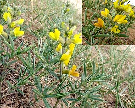 2.小沙冬青 常绿小灌木,高40-70cm。老枝粗达1.5cm,草褐色或黄绿色,木质部淡黄色;小枝被短柔毛,呈灰白色。托叶披针形,被短柔毛;叶为单叶,极少为三出复叶;小叶宽椭圆形、宽倒卵形或倒卵形,长2-2.5cm,宽1-2cm,先端锐尖,基部宽楔形或稍圆,具3主脉,两面密被短柔毛,呈灰绿色。总状花序顶生或侧生,约10花,花梗长6-9mm,被短柔毛;萼筒钟形,齿三角状;花冠黄色;雄蕊分离。荚果长圆形,稍膨胀,有皱纹。种子1-5颗,肾形。花期5-6月,果期7-8月。