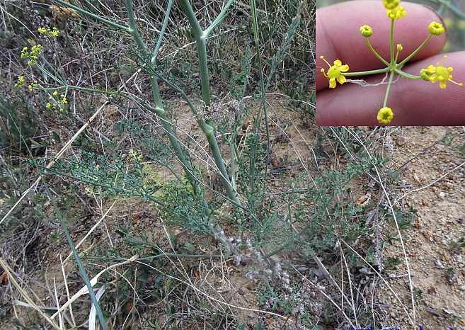 多年生草本,高20~100厘米。根粗大。茎直立,基部有纤维质鞘,有分枝,苍白色。叶多半根生,无毛,卵形至三角形,长4~20厘米,2~3回羽状深裂,最终裂片楔形至倒卵形,长1~3毫米,宽1毫米,肥厚,极叉开,常3裂,具粗齿或裂片;叶柄长5~15厘米,茎生叶有短柄,具扩张叶鞘。复伞形花序;总花梗长15~30厘米;无总苞或有1~2片;伞幅7~15,近等长;小总苞片数个,条形,和花等长,粗糙,或缺如;花梗多数;花黄色。双悬果矩圆形,长10~13毫米,宽3~5毫米,扁平,无毛;果柄长12~20毫米,侧棱宽,具木栓质翅。花期5~8月。果期7~9月。