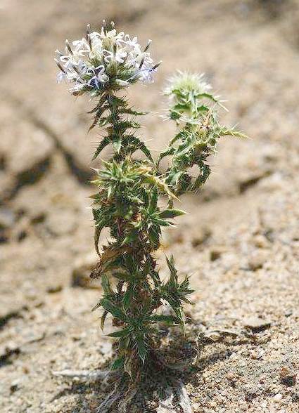 多年生草本,高可达30~60厘米。分枝少。叶互生,无柄,披针形,长5~6厘米,宽1~1.5厘米,锐尖,基部抱茎,边缘有白色的针刺状牙齿,针刺长达5毫米,两面谈绿色。复头状花序圆球形,生茎顶,径约1~2.5厘米,白绿色或淡蓝色;小头状花外总苞为白色冠毛状刚毛,完全分离。花期6~9月。
