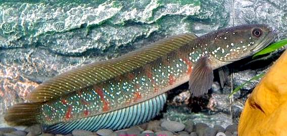 体略呈圆筒形,后部侧扁。全长约30厘米。头略尖,头部有较大的鳞片,口大,端位,口裂倾斜,下颌略突。两颌、锄骨及口盖骨均有齿;下颌更杂有大型的齿。侧线鳞59~62。背鳍、臀鳍均长,背鳍47,胸鳍14,臀鳍29,无腹鳍。尾鳍椭圆形。体色棕灰,腹部色较浅,体侧有V形黑纹11条。在尾鳍的基部和胸鳍的上方,各有一大形黑斑。头上、背上和体侧有许多白色小斑。从鳃盖到眼后方每侧各有黑纹2条。