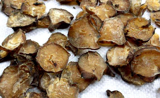 ②黑顺片:选取中等大小的泥附子,洗净后浸入盐卤水液中数日,并与盐卤水同煮沸,捞出,水漂,切成厚片,再浸入稀盐卤水液中,并加入黄糖及菜油制成的调色剂,使附片染成浓茶色,用水漂冼至口尝无麻辣感时,取出蒸熟,烘至半干,再晒干。