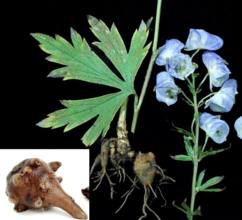 ②《本草图经》:“乌头、乌喙生朗陵山谷;天雄生少室山谷;附子、侧子生键为山谷及广汉,今并出蜀土。然四品都是一种所产,其种出于龙州。种之法,冬至前先将肥腴陆田耕五、七遍,以猪粪粪之,然后布种,逐月耘耔,至次年八月后方成。其苗高三、四尺已来,茎作四楼,叶如艾,花紫碧色作穗,实小,紫黑色如桑椹。本只种附子一物,至成熟后,有此四物,收时仍一处造酿方成。酿之法,先于六月内踏造大、小麦曲,至收采前半月,预先用大麦煮成粥,后将上件曲造醋候熟,淋去糟。其醋不用太酸,酸则以水解之。便将所收附子等去根须,于新洁瓮内淹浸七日。每日搅一遍,日足捞出,以弥疏筛摊之,令生白衣,后向慢风日中晒之百十日,以透干为度,若猛日晒则皱而皮不附肉。其长三、二寸者为天雄,割削附子傍尖芽角为侧子,附子之绝小者,亦名为侧子,元种者母为乌头,其余大小者皆为附子,以八角者为上,如方药要用,须炮令裂去皮脐使之。绵州彰明县多种之,惟赤水一乡者最佳。然收采时月与《本经》所说不同,盖今时所种如此,其内地所出者与此殊别,今亦稀用。谨按《本经》冬采为附子,春采为鸟头,而《广雅》云,奚毒,附子也。一岁为侧子,二岁为乌喙,三岁为附子,四岁为乌头,五岁为天雄。今一年种之,便有此五物,岂今人种莳之法,用力倍至,故尔繁盛也。虽然,药力当缓于岁久者耳。”