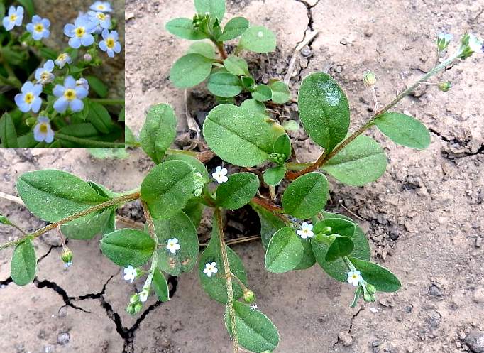 一年生草本,高5~30厘米。茎通常白基部分枝,纤细,直立,或丛生,具平伏细毛。叶互生,匙形、椭圆形或披针形,长1~3厘米,宽5~20毫米,先端圆钝或尖锐,基部狭窄,两面均具平伏粗毛;下部叶具短柄,上部叶无柄。总状花序顶生,细长,不具苞片;花通常生于花序的一侧,有柄,长3~6毫米;花萼长1~2.5毫米,5裂,裂片长圆形,先端尖锐;花冠蓝色,长约1.5毫米,5裂,裂片卵圆形,先端圆钝;雄蕊5;子房深4裂,花柱线形,柱头头状。小坚果三角状四边形,具细毛,少有光滑,有小柄。花期5~6月。