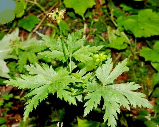 多年生草本,高20~45厘米。全株无毛。不分枝或上部分枝。基生叶约3;叶片五角形,长2~3厘米,宽3.5~5厘米,基部心形,3全裂,中央裂片宽菱形,3深裂,边缘具小裂片,侧生裂片斜扇形,不等地2深裂;茎生叶约4,似基生叶;具长柄。花单生于茎或分枝顶端;萼片5,白色,倒卵形或椭圆形,长9~10毫米,宽4~6毫米,顶端圆或钝;无花瓣;雄蕊多数,长2.5~5毫米;心皮7~12,具短柄。菁荚果黑褐色,长0.9~1.4厘米,宽约4.5毫米,在背缝线中部以下有三角形突起。