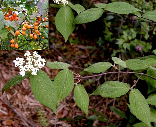 落叶灌木,高至4米。叶对生,卵形至长椭圆形,长5~12厘米,宽2~5厘米,先端渐尖,基部圆或阔楔形,边缘中部以上有锐锯齿,下面暗绿色,脉上有绢毛;叶柄短,长约8毫米,无毛。聚伞花序顶生,径3~4厘米,具膜质早落的线状苞片;花梗长约5厘米,有毛。花白色;萼5裂,紫色,有毛;花冠5裂;雄蕊5。浆果卵形,有嘴,长约7毫米,光滑,熟时橙红色,内有种子1粒。花期5~6月。果熟期10月。