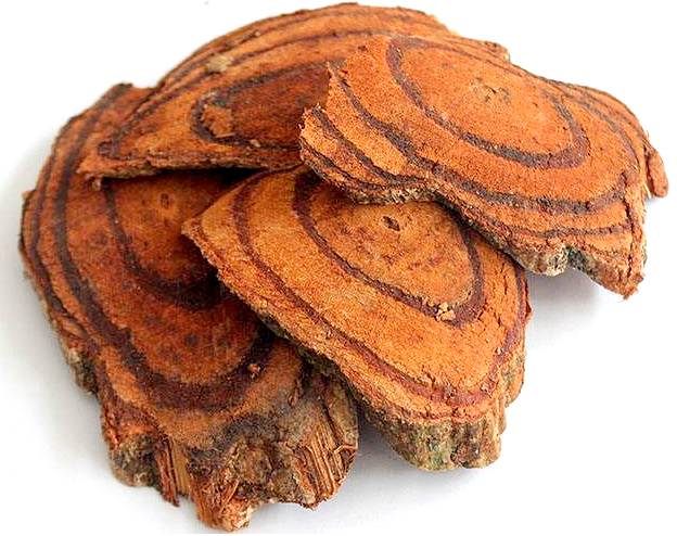 【性状】本品为椭圆形、长矩圆形或不规则的斜切片,厚0.3~1cm。栓皮灰棕色,有的可见灰白色斑,栓皮脱落处显红棕色。切面木部红棕色或棕色,导管孔多数;韧皮部有树脂状分泌物呈红棕色至黑棕色,与木部相间排列呈3~8个偏心性半圆形环;髓部偏向一侧。质坚硬。气微,味涩。