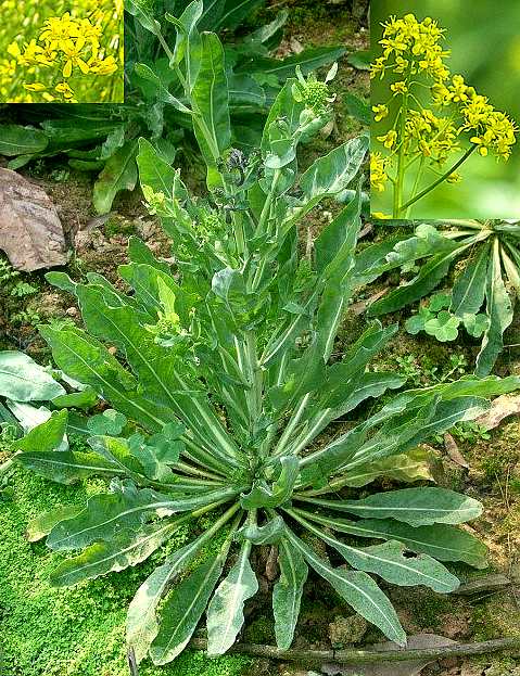 二年生草本。主根深长,直径5~8毫米,外皮灰黄色。茎直立,高40~90厘米。叶互生;基生叶较大,具柄,叶片长圆状椭圆形;茎生叶长圆形至长圆状倒披针形,在下部的叶较大,渐上渐小,长3.5~11厘米,宽0.5~3厘米,先端钝尖,基部箭形,半抱茎,全缘或有不明显的细锯齿。阔总状花序:花小,直径3~4毫米,无苞,花梗细长;花萼4,绿色;花瓣4,黄色,倒卵形;雄蕊6,4强;雌蕊1,长圆形。长角果长圆形,扁平翅状,具中肋。种子1枚。花期5月。果期6月。