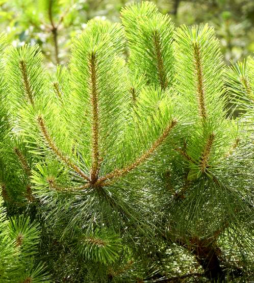 常绿乔木,高可达40米。树皮红棕色,成不规则长块状裂。小枝常轮生,红棕色,具宿存鳞片状叶枕,常翘起,较粗糙;冬芽长椭圆形,芽鳞红褐色,叶针形,2针一束,细长而柔韧,长13~20厘米,叶缘具细锯齿;叶鞘膜质,灰白色,永存。雄球序椭圆形至卵形,开后延长成?荑状,黄色,雄蕊具2花粉囊;雌球序椭圆形,肉紫色。松球果卵状圆锥形,长4~7厘米,直径2.5~4.5厘米,果鳞木质,鳞片盾菱形,鳞突较平坦,微具脊,鳞脐小而短,微凹或微凸。花期4~5月。果熟期翌年10月。