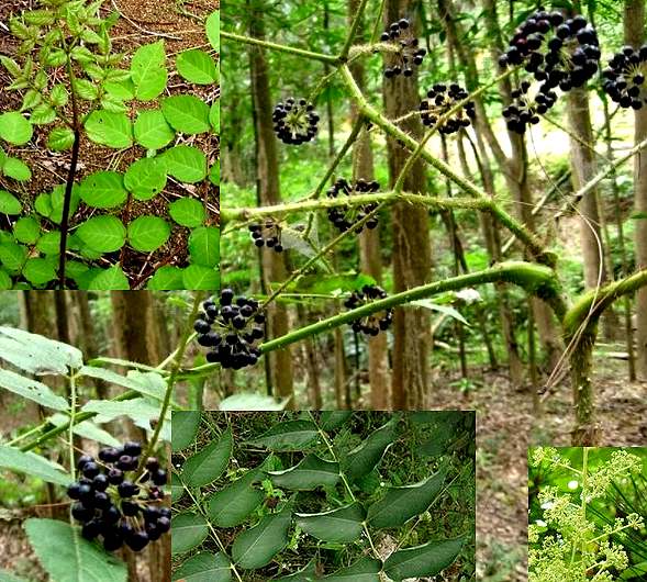 小乔木,高1.5~3米。树皮灰色,密生坚刺,老时渐脱落;小枝淡黄色,疏生细刺。叶大,互生,2~3回单数羽状复叶,长可达1米,常集生于枝端;叶柄有刺;小叶多数,卵形或椭圆状卵形,长5~15厘米,宽2.5~8厘米,先端渐尖,基部圆形、阔楔形或微心形,边缘为粗阔的大牙齿或为尖锐小锯齿,上面暗绿色,下面粉绿带灰蓝色。由多数小伞形花序合咸圆锥花序,大而密,主轴短,长2~5厘米,花轴及花梗上密生短柔毛;苞片披针形;萼杯状,先端5裂;花瓣5,淡黄白色;雄蕊5;子房下位,5室,花柱5,离生。浆果状核果,球形,黑色,径约4毫米,花柱宿存。花期7~8月。果期9月。