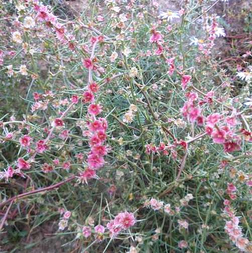 一年生草本,高达1米。小枝硬,平散,绿色,通常有白绿色条纹,无毛或有极短的乳头状刚毛。叶互生,丝状圆柱形,肉质,长1.5~4厘米,宽1~2毫米,近基部处扩大,先端刺状锐尖,无柄,绿色。花两性,腋生,通常在各枝上端形成穗状花序;苞片2枚,锥形或卵形,先端具细尖;花被片5,锥形或尖卵形,直立,覆瓦状排列;雄蕊5;柱头长丝状,2歧。果实球形,粉红色,顶端截形,包于带翅的花被片内。花期7~9月。果期9~10月。