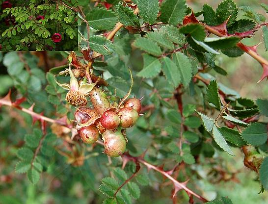 落叶灌木,高2~3米。茎直立,红褐色,多分枝,有锐刺。叶互生,单数羽状复叶;小叶9~11,卵圆形,先端钝或浑圆,边缘有单或重锯齿,基部广楔形,无柄:花单生或簇生,淡红色;花瓣5;雄蕊多数;心皮多数。果实圆球形,有刺毛,深红色。花期6~7月。果期8~9月。