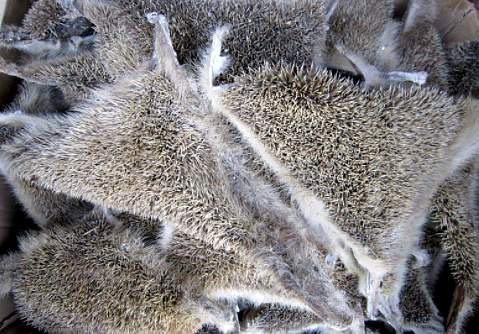 【炮制】炒刺猬皮:取拣净的刺猬皮,剁成小块,洗净,晒干,另取滑石粉置锅内炒热,加入刺猬皮,炒烫至黄色,取出,筛、刷去滑石粉,剪去毛,放凉。