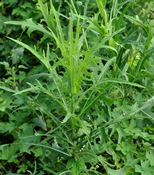 一年或二年生草本,高80~120厘米。全体均含有白色乳汁。主根数个,圆锥形。茎单一,直立,圆柱形,疏生长毛,上部多分枝。叶互生,通常无柄,叶片披针形或长圆状披针形,长7~10厘米,宽3~5厘米,羽状分裂,裂片边缘复作齿牙状,先端裂片较大,两侧裂片略下倾,先端尖锐或渐尖、或钝,基部呈耳廓状抱茎,耳缘具锯齿,上面绿色,下面浅绿,主脉上具有长毛。头状花序顶生,排列成圆锥花丛,总苞圆筒状;苞片覆瓦状排列,内列苞片披针形,较长,外列苞片短小;花淡黄色,全部舌状;雄蕊5,着生花冠管上;子房下位,花柱纤细,柱头2裂。瘦果卵圆形,扁平,黑色,先端具喙,冠毛白色,细软。花期5~9月。