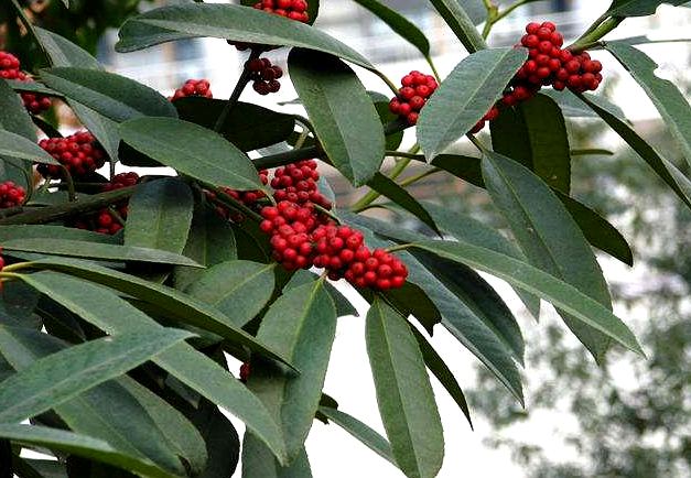 常绿乔木,高达15米,直径约60厘米。树皮赭黑色或灰黑色,粗糙有浅裂,枝条粗大,平滑,新条有角棱。叶革质而厚,螺旋状互生,长椭圆形或卵状长椭圆形。先端锐尖,或稍圆,基部钝,边缘有疏齿,上面光泽,下面有主脉突起。聚伞花序,多数密集在前年度叶腋,雄花序1~3朵,雌花序则仅有1花;苞卵形,多数;萼4裂,裂片卵形,有缘毛,黄绿色;花瓣4,椭圆形,基部愈合,其长为萼之3倍;雄花有雄蕊4,较花瓣为长,花丝针形,药卵形,中央有退化子房,两性花中雄蕊与花瓣等长;子房球状卵形。核果球形,成熟后红色,有残留花柱;分核4颗,有3棱。花期4月。果熟期11月。