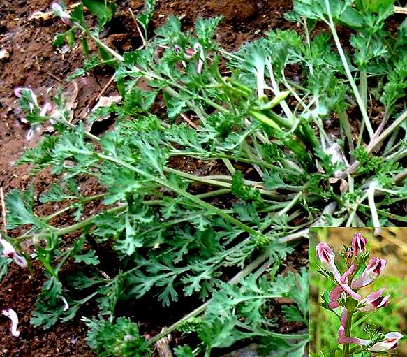 【性状】为干燥皱缩全草,长5~10厘米,叶具长柄;叶片3回羽状深裂,裂片狭细。叶腋有淡紫色小花,或长椭圆形扁平的荚果,表面灰绿色,内含数粒扁圆形、黑色的种子。味苦。