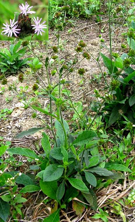 多年生直立草本,高30~60厘米。有时全体被白色紧贴的粗毛。茎二歧分枝,枝少而硬,粗糙。单叶大部基生,匙形或长圆状倒披针形,长5~15厘米,宽2~4.5厘米,基部渐狭,先端钝或短尖,边缘略具钝锯齿:茎生叶少而细,叶柄长5~15毫米,基部扩大抱茎,或近无柄。头状花序约有小花4朵,生于枝顶;通常有3片叶状苞,苞叶卵形或长圆状卵形,长1~1.5厘米;头状花序在每一花束内有多个,密集;总苞片长8~10毫米;花托无毛;小花全为管状,两性,淡紫色,长7~9毫米,先端4裂,一边开裂,裂片稍阔展;雄蕊4~5,略伸出管外;子房下位,1室。瘦果有棱,顶端具长硬刺毛4~6。花期8~12月。果期11月至次年2月。