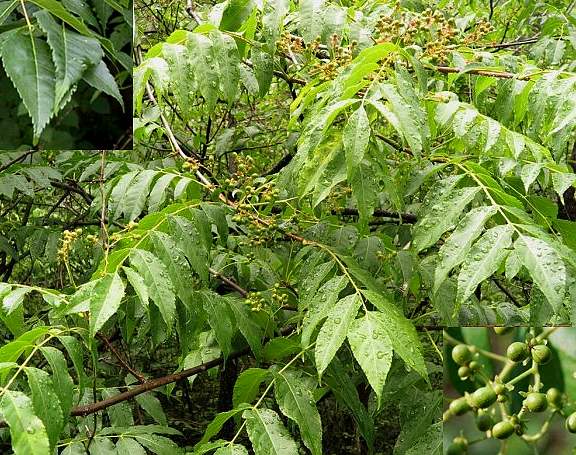 灌木或落叶小乔木,高7~10米。树皮灰黑色;幼枝灰绿色,无毛,具明显黄色皮孔。单数羽状复叶,互生,常集生于枝端,长20~30厘米,小叶11~13;小叶片卵状披针形至阔卵形,长4~10厘米,宽2~4厘米,先端长尖,基部阔楔形,两侧不对称,边缘具不整齐锯齿;柄极短或几无柄。花黄绿色而小,雌雄异株,6~8朵集成腋生聚伞花序,总梗长达12厘米,密生短柔毛;花萼4~5,卵形,有时被细毛;花瓣4~5,倒卵形,比萼片长约2倍;雄蕊4~5,着生在4~5裂的花盘基部;雌花较雄花小,子房卵形,4~5室,花柱4~5,彼此相拥扭捩,基部连合。核果倒卵形,肉质,红色,基部具宿存花萼。花期4~5月。果期8~9月。